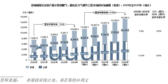 暖气、通风及冷气调节工程是机电工程行业的主要细分领域之一,以产值计算占整体市场规模约15.1%。受市区重建、可持续发展计划及技术进步推动,香港暖气、通风及冷气调节工程的市场规模增长强劲。2024年的市场产出总值达约10,894.0百万港元,2020年至2024年的复合年增长率约9.4%,预期将于2029年进一步增至约15,250.3百万港元,2025年至2029年的复合年增长率微降至约7.1%。私营领域为增长的主要驱动因素,贡献金额由2020年约4,702.7百万港元增至2024年约6,369.3百万港元,期内复合年增长率约7.9%。持续扩张得益于老旧私人楼宇的翻新及现代化改造,尤其是在住宅与商业领域,当中业主╱物业管理人希望提升能源效率,符合室内空气质量(“IAQ”)标准并保持与新开发项目的竞争力。私营领域预计将于2025年至2029年期间按复合年增长率约5.8%增长,并于2029年达约8,318.3百万港元,反映对升级及智能暖气、通风及冷气调节技术的稳定需求。