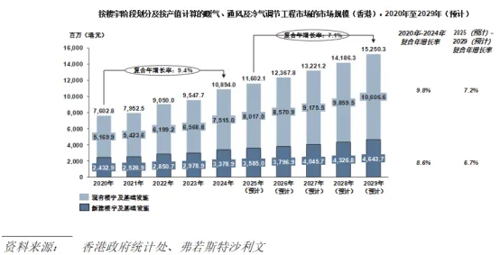 在最新监管法规、公共卫生优先事项以及城市可持续发展目标的推动下,IAQ意识正逐渐成为香港的重大市场驱动因素。透过其办公室及公众场所室内空气质素检定计划,环境保护署(“环境保护署”)在推动空气质素改善方面扮演关键角色。根据最新可得资料,截至2023年,超过2,100间处所已获室内空气质素检定认证,较2003年计划开始时增加25倍。于2024年全面实施的室内空气质素最新目标已收紧一氧化碳、可吸入悬浮颗粒物、氡气及二氧化氮等污染物的规定,并加入霉菌作为新指标。该等更严格标准导致对暖气、通风及冷气调节系统升级、先进空气过滤技术及合规谘询需求急升,尤其是老旧楼宇及高流量公共空间。绿建环评及LEED等绿色建筑标签日益普及亦促进该趋势,推动发展商与物业管理人采用针对室内空气质素的解决方案,包括具能源效益的通风系统及实时空气质素监测,进而提升租户满意度、改善环境、社会及管治(“ESG”)表现及维持竞争力,为暖气、通风及冷气调节系统升级及维护缔造更多市场机会。此外,香港联交所的ESG披露规定要求上市房地产集团测量并报告楼宇能耗及室内空气质量数据,为其物业管理部门提供明确的财务及声誉激励,以安装实时监测系统、升级通风系统并采取节能措施。这些因素共同推动暖气、通风及冷气调节系统升级、先进空气过滤技术以及相关维护及谘询服务市场的扩张。于2020年至2023年香港爆发COVID-19疫情突显有效的通风系统在人员密集空间中减少空气传播病原体的关键作用,推动了对先进楼宇系统升级的需求,例如高效滤网过滤器、紫外线C消毒和智慧通风技术。这促使各机构采用更严格的通风规程并改造过时的系统,为暖气、通风及冷气调节供应商创造机会提供更强大的改造、维护和即时监控解决方案。COVID-19疫情后,人们对室内空气质素的意识不断提高,以暖气、通风及冷气调节系统工程产值计算,市场规模由2020年的约988.3百万港元增至2024年的约1,465.2百万港元,复合年增长率为10.3%,并预期由2025年的约1,566.2百万港元增至2029年的约2,089.2百万港元,2025年至2029年的复合年增长率为7.5%。