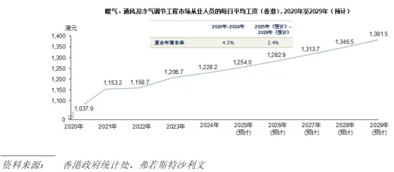 诚如香港政府统计处所报告,香港暖气、通风及冷气调节工程市场工人的每日平均工资反映制冷、空调及通风技工收入的官方数据。工资于多年来稳定上升,由2020年的1,037.9港元上升至2024年的1,228.2港元,复合年增长率约为4.3%。该增长受暖气、通风及冷气调节工程市场对熟练劳工的需求持续上升及持续劳动短缺推动。
