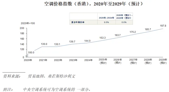 空调是暖气、通风及冷气调节系统的关键元件。香港的空调价格指数由2020年的100.0上升至2024年的144.0,2020年至2024年的复合年增长率约9.5%。增长乃受与疫情相关的生产基地关闭及供应链问题后的复甦所推动。由于暖气、通风及冷气调节工程的需求持续增加,预期2025年至2029年香港空调价格指数的复合年增长率约为8.6%。香港的空调价格不断上涨,提高了暖气、通风及冷气调节系统的安装、维护及改装成本,同时推动市场向节能及先进系统发展。