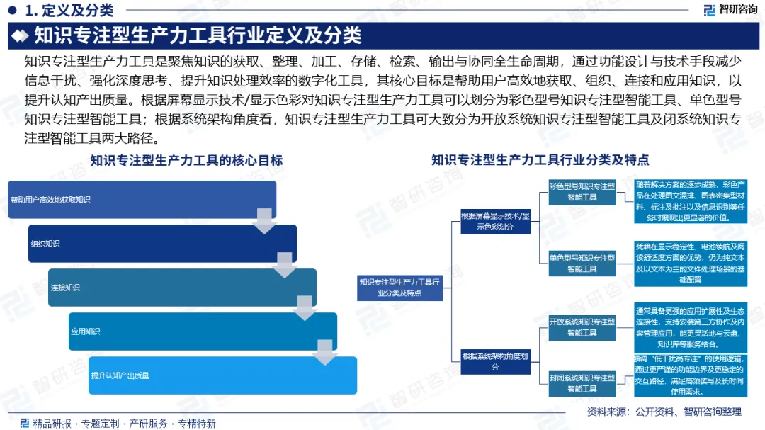 行业分类:根据屏幕显示技术/显示色彩对知识专注型生产力工具可以划分为彩色型号知识专注型智能工具、单色型号知识专注型智能工具;根据系统架构角度看,知识专注型生产力工具可大致分为开放系统知识专注型智能工具及闭系统知识专注型智能工具两大路径。