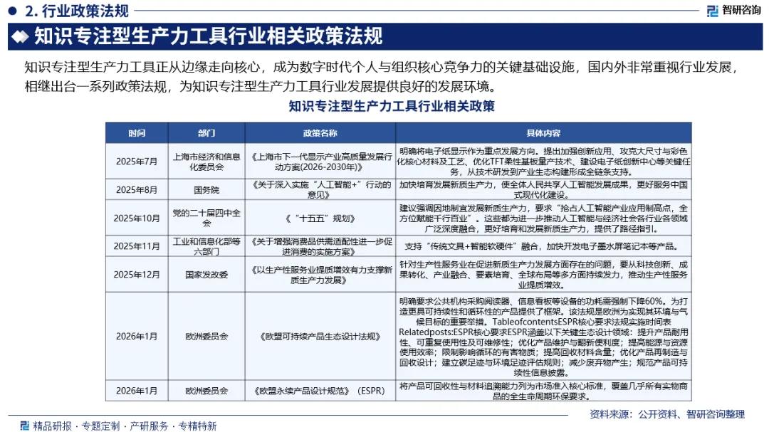 行业相关政策法规:知识专注型生产力工具正从边缘走向核心,成为数字时代个人与组织核心竞争力的关键基础设施,国内外非常重视行业发展,相继出台一系列政策法规,为知识专注型生产力工具行业发展提供良好的发展环境。如《上海市下一代显示产业高质量发展行动方案(2026-2030年)》《关于增强消费品供需适配性进一步促进消费的实施方案》《欧盟可持续产品生态设计法规》《欧盟永续产品设计规范》(ESPR)等。
