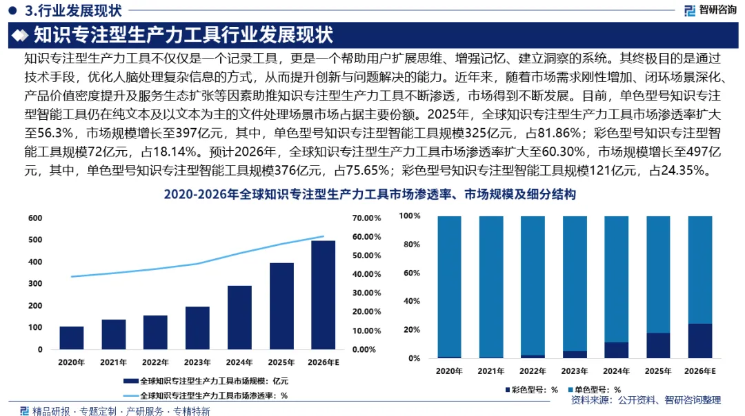 知识专注型生产力工具不仅仅是一个记录工具,更是一个帮助用户扩展思维、增强记忆、建立洞察的系统。其终极目的是通过技术手段,优化人脑处理复杂信息的方式,从而提升创新与问题解决的能力。近年来,随着市场需求刚性增加、闭环场景深化、产品价值密度提升及服务生态扩张等因素助推知识专注型生产力工具不断渗透,市场得到不断发展。目前,单色型号知识专注型智能工具仍在纯文本及以文本为主的文件处理场景市场占据主要份额。2025年,全球知识专注型生产力工具市场渗透率扩大至56.3%,市场规模增长至397亿元,其中,单色型号知识专注型智能工具规模325亿元,占81.86%;彩色型号知识专注型智能工具规模72亿元,占18.14%。预计2026年,全球知识专注型生产力工具市场渗透率扩大至60.30%,市场规模增长至497亿元,其中,单色型号知识专注型智能工具规模376亿元,占75.65%;彩色型号知识专注型智能工具规模121亿元,占24.35%。