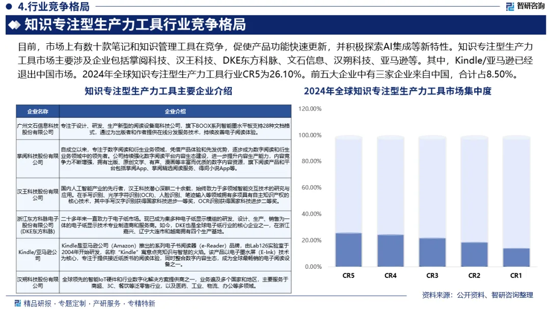 竞争情况:目前,市场上有数十款笔记和知识管理工具在竞争,促使产品功能快速更新,并积极探索AI集成等新特性。知识专注型生产力工具市场主要涉及企业包括掌阅科技、汉王科技、DKE东方科脉、文石信息、汉朔科技、亚马逊等。其中,Kindle/亚马逊已经退出中国市场。2024年,全球知识专注型生产力工具行业CR5为26.10%。前五大企业中有三家企业来自中国,合计占8.50%。