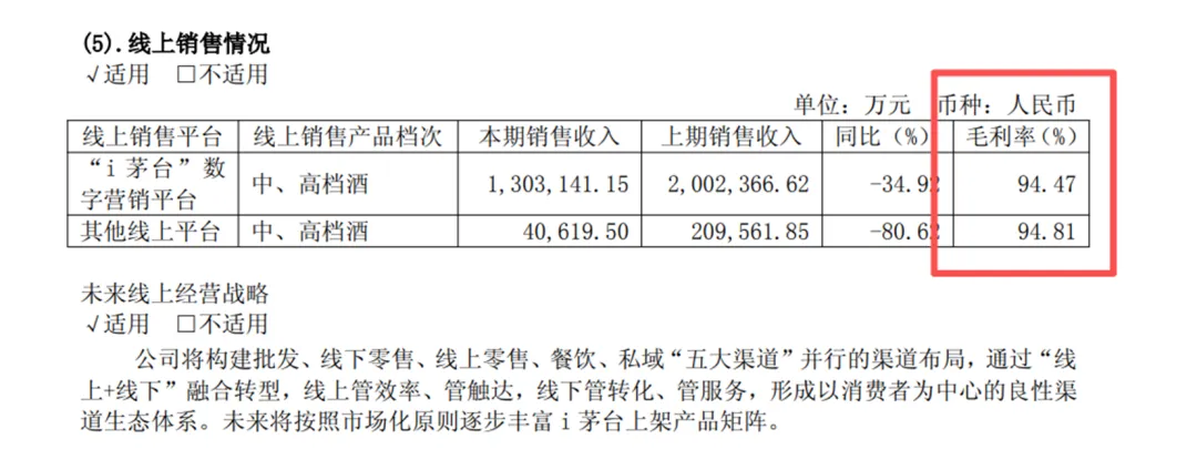 2、在线上部分,i茅台毛利率94.47%,其他线上销售平台94.81%。