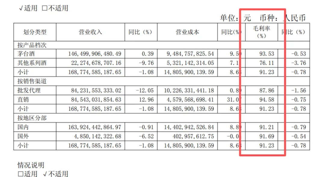 翻查贵州茅台2025年财报,共有三个表格涉及“毛利率”这一个关键指标,原文粘贴如下↓