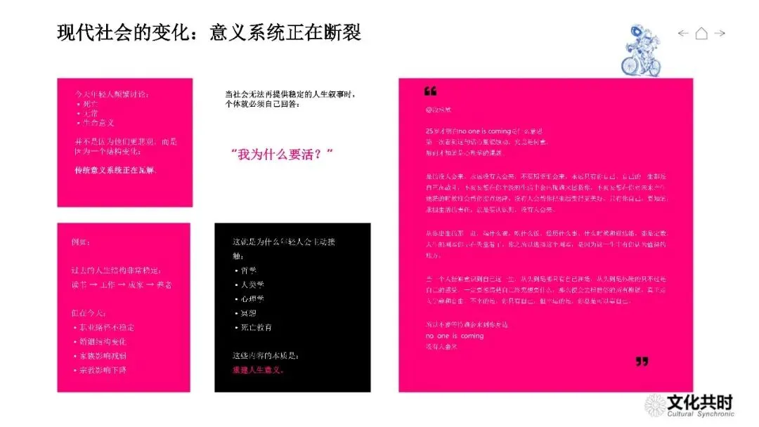 识别正在形成的新意义结构,不是找趋势,而是找人们如何重新理解生活,哪些旧意义正在失效,哪些新意义正在形成,输出意义地图。