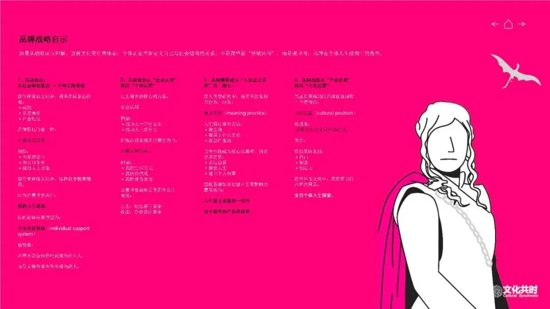 因此品牌在战略层面有三个具体方向。做主体性支持型品牌,帮助消费者建立自信表达观点坚持选择,强调独立真实和边界。做个性表达型品牌,提供个性化产品和自定义体验,让消费者表达自己的生活方式。做自我探索型品牌,不只是卖产品,还提供内容社群和体验,帮助消费者探索我是谁。
