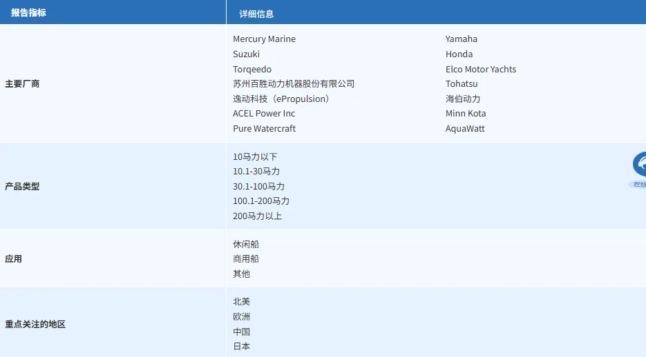 1. 竞争格局:汇聚Mercury Marine、Yamaha等国际巨头,及苏州百胜动力、逸动科技等国内优质企业,产品涵盖多功率等级,适配休闲船、商用船等场景;
