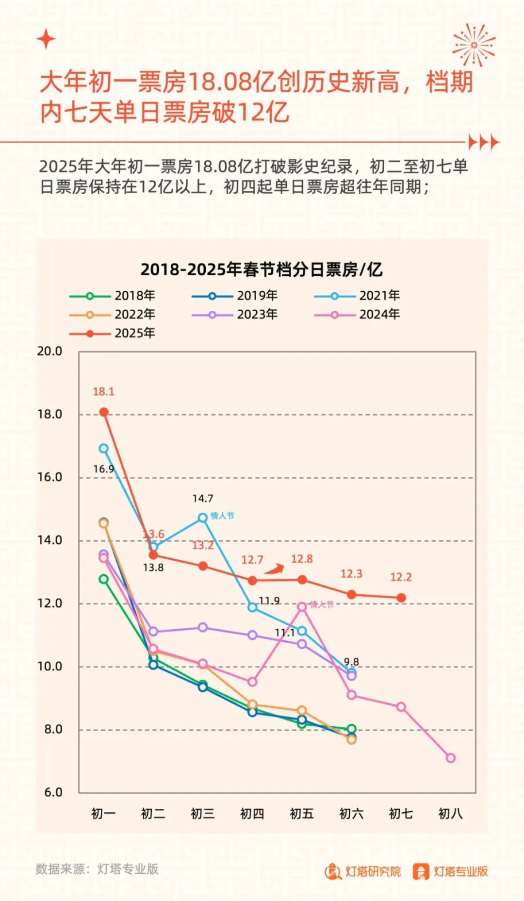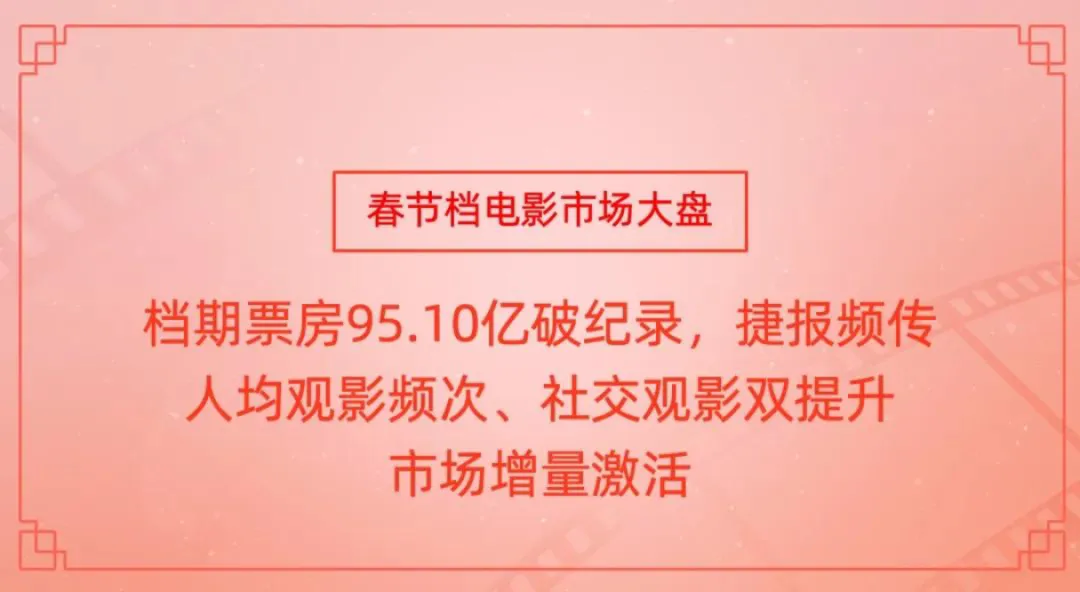 • 档期票房破历史纪录,达95.10亿:2025年春节档实现影史最高票房,日均票房11.9亿,观影人次1.87亿,上座率43.3%,市场大盘全面复苏并超越疫情前水平,释放出国内文娱消费强劲回暖信号。