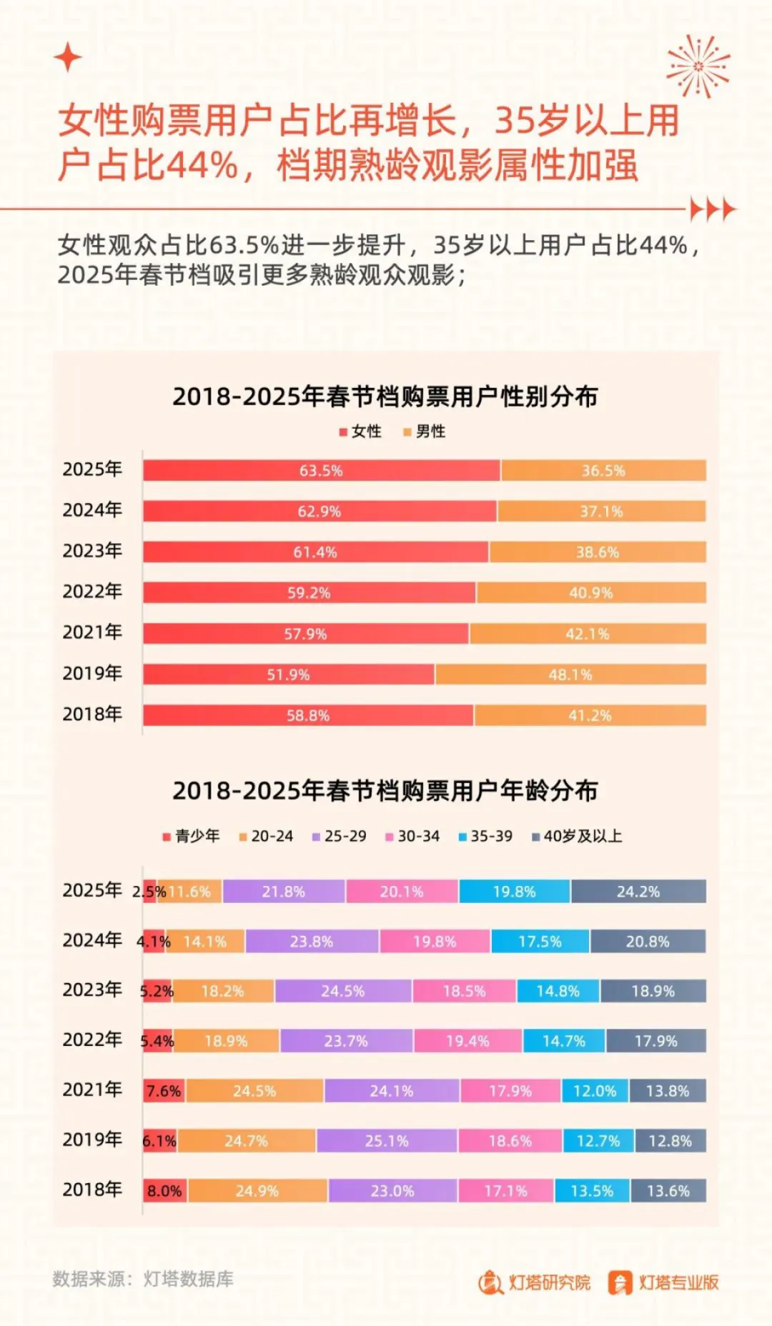 • 熟龄用户崛起,35岁以上观众占比达44%:女性购票比例升至63.5%,35-39岁及40岁以上群体偏好《哪吒》《熊出没》,反映家庭观影、情感陪伴类内容需求旺盛,提示品牌在内容叙事中应强化代际连接与情绪价值。