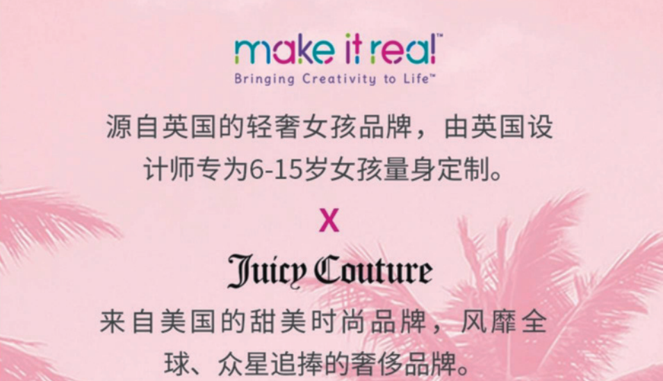 玩具品牌与其他品牌联名的前提是合作品牌非竞品,即跨界联名。如英国轻奢品牌MAKE IT REAL与美国奢侈品牌Juicy Couture联名推出的施华洛世奇闪亮水晶首饰套装,将Juicy Couture的甜美时尚风格带入到MAKE IT REAL的女孩玩具饰品中。