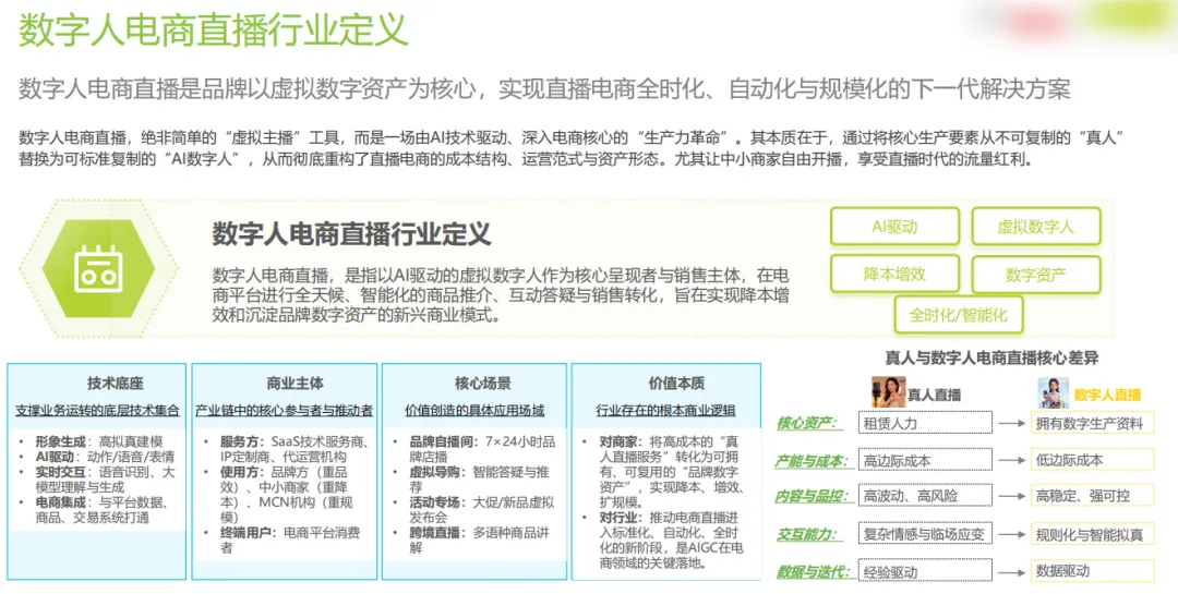 报告指出,数字人直播已不是可选项,而是商家标配。它解决真人主播成本高、流失快、难以 24 小时在线的痛点,让中小商家也能实现 “日不落直播间”,成本降至传统直播的 1/10 甚至更低。2025 年起,政策明确监管、平台大力扶持、技术快速成熟,行业从野蛮生长走向高质量发展。