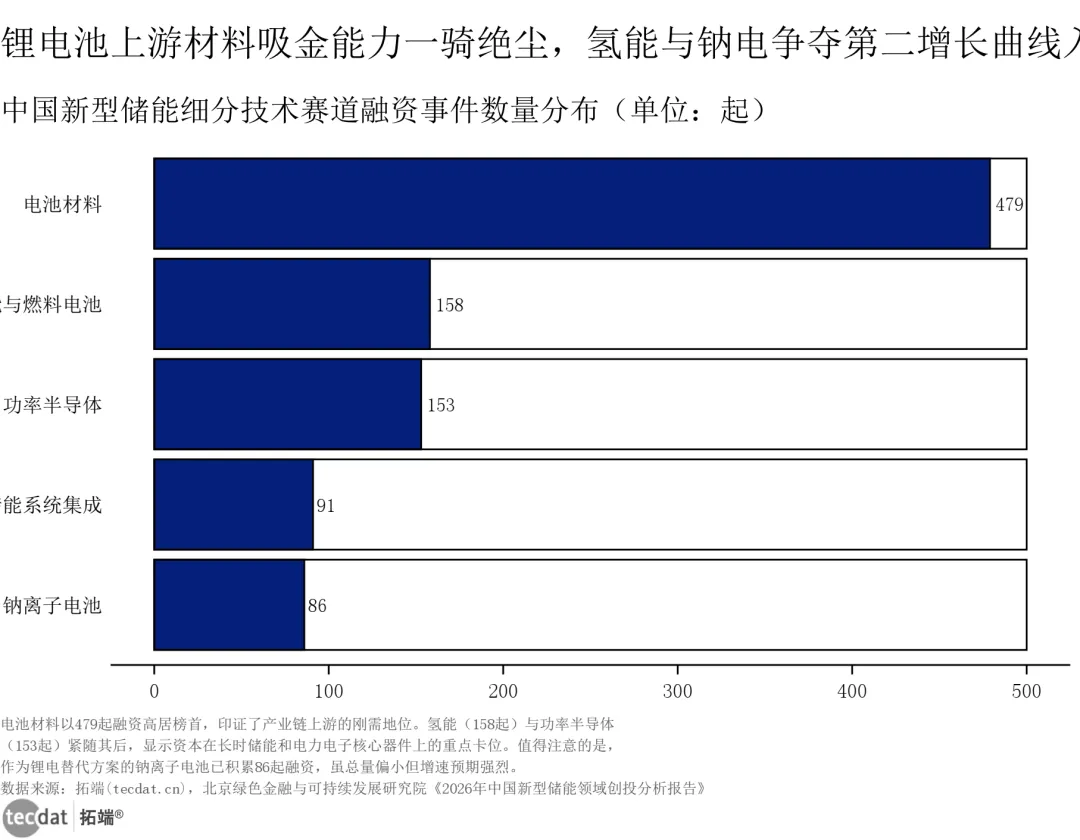 看看这张技术赛道图你就懂了,上游的电池材料虽然还是吸金王(479起),但**氢能与燃料电池(158起)、钠离子电池(86起)**正在疯狂抢夺第二增长曲线的入场券。还在死磕低端集成的,赶紧醒醒!