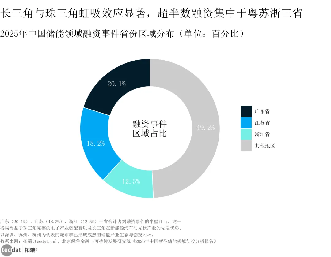 报告显示,广东、江苏、浙江三省拿走了全国超50%的融资事件。这背后不仅仅是产业链配套的问题,更是深创投、晨道资本(宁德时代系)、国家电投这些“国家队”和产业资本在重新定义游戏规则。