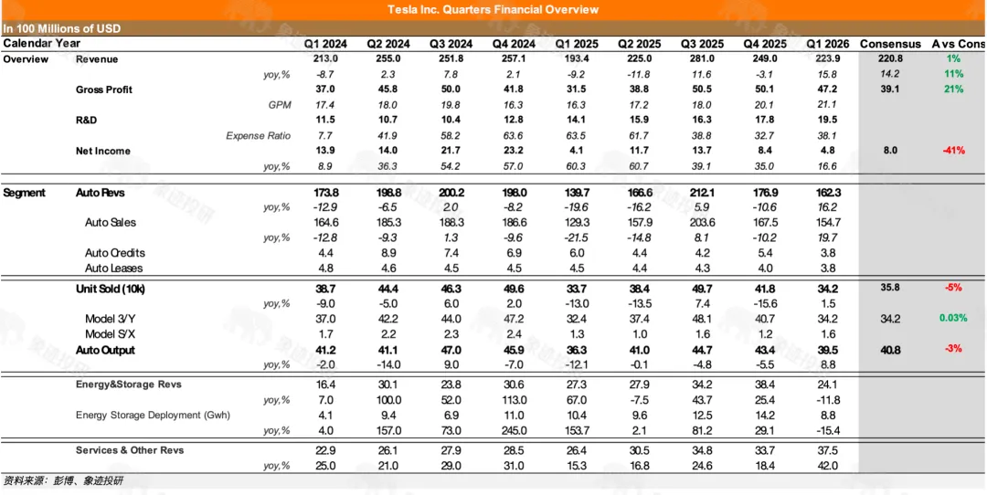 汽车收入162亿美元,同比增16%,主要靠交车量回暖和车价微涨撑着,FSD订阅也帮了忙。Model 3和Model Y还是台柱子,一季度这两款交付约34.2万辆,占交付总数九成五以上。Cybertruck和Semi刚进早期爬坡,贡献甚微。同时,管理层也打了预防针——新产线开始应该是S曲线。