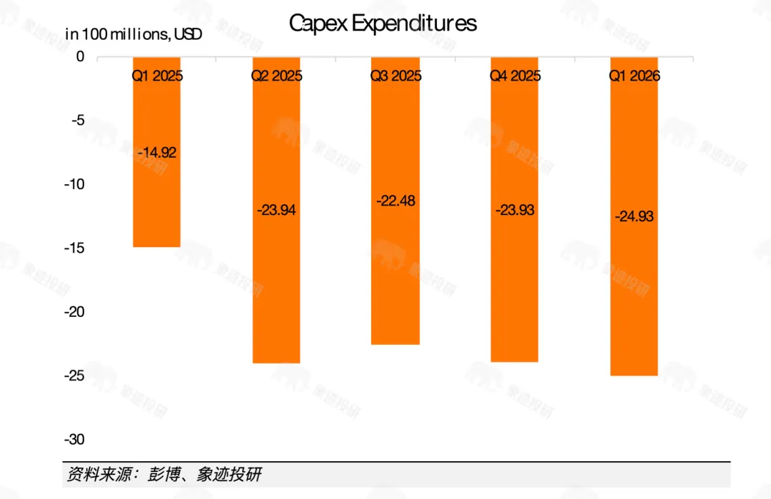 最大的现金消耗就是资本开支本身。14.44亿美元的自由现金流,较去年同期的6.6亿好了一倍多,也比上个季度的14.2亿强点。问题出在“如果”上。如果今年资本开支真达到250亿美元以上,那接下来平均每季度要烧掉将近80亿。一季度正的自由现金流到二季度大概率转负,而且窟窿会迅速变大。管理层在电话会中表示,今年剩下的时间预计自由现金流都会是负数。这并非被动流血,而是主动选择的逆周期投资。