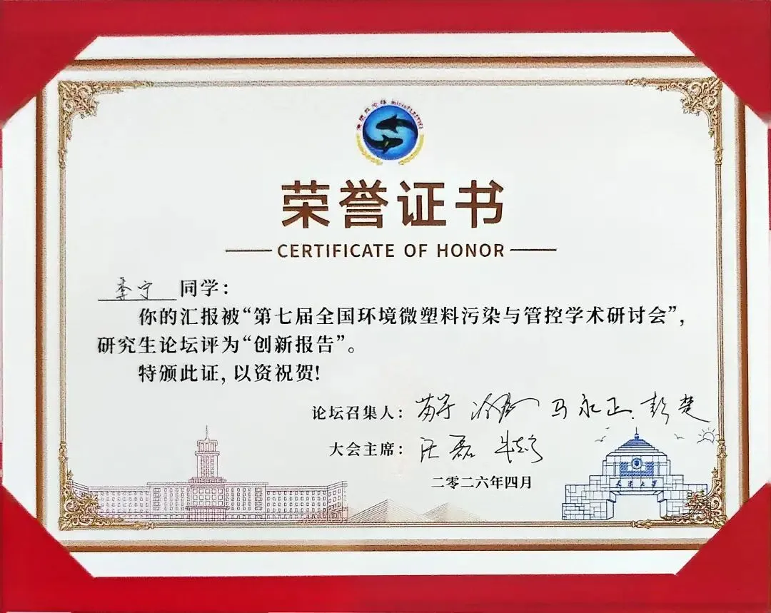 4月20日,第七届全国环境微塑料污染与管控学术研讨会在天津圆满落幕。经过大会学术委员会严格评审,黄河三角洲生态环境研究中心(山东省黄河三角洲生态环境重点实验室)2024级环境工程专业硕士研究生李宁所作的学术报告,从众多报告中脱颖而出,荣获“研究生创新报告奖”。