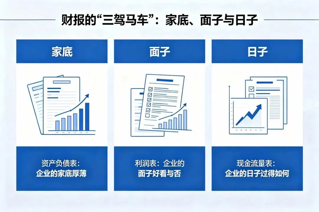 很多人一听到“财报”两个字就头大,觉得那是注册会计师才看得懂的天书。其实你完全可以把它看作是一个人的“年度体检报告”。 去医院体检,你不懂医学原理,但你能看懂“转氨酶偏高”代表肝脏负荷大,“血压超标”代表心血管有风险。看财报也是一样的道理,我们不需要学会怎么做账,我们只需要学会找异常、看趋势。老板的嘴可以骗人,PPT上的宏大战略可以吹嘘,但要凭空造出一份完美且毫无破绽的财务报表,成本极高且极易留下蛛丝马迹。读懂财报,就是让你拥有了一双识破资本市场“障眼法”的火眼金睛。二、 财报的“三驾马车”:家底、面子与日子