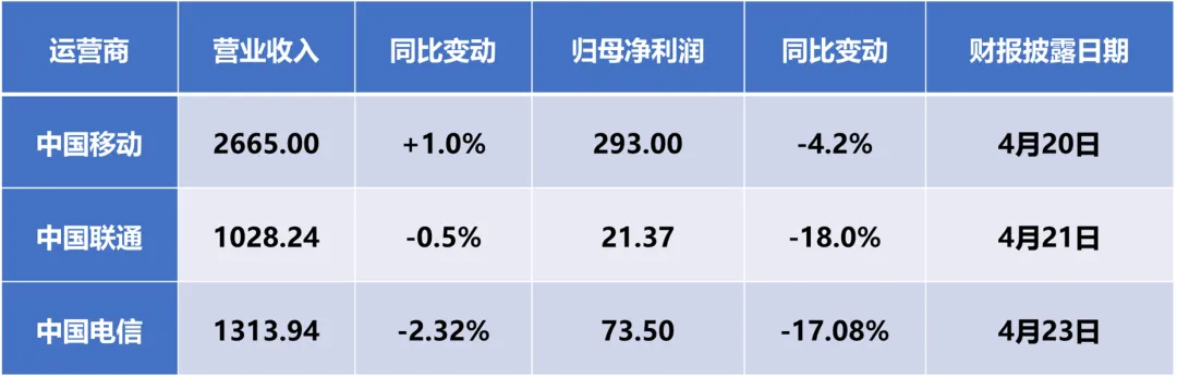 截至4月23日,中国移动、中国联通、中国电信三大通信运营商相继披露2026年第一季度财报。