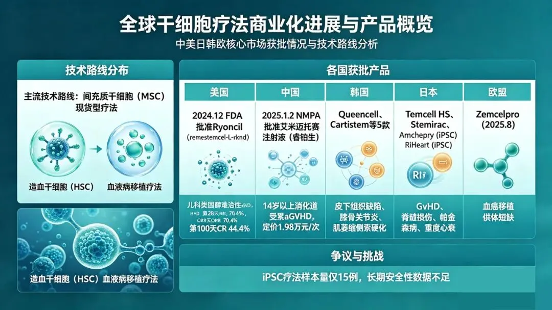 全球干细胞疗法正处于从临床研究加速走向商业化的关键阶段,近年来在中美日韩欧等多个核心市场迎来获批高潮,初步形成多国并进的格局。截至最新统计,全球范围已获批上市的干细胞药物超17款。这些产品主要分为两大主流技术路线:以间充质干细胞(MSC)为主的“现货型”再生与免疫调节疗法,和以造血干细胞(HSC)为核心的恶性及非恶性血液病移植疗法。