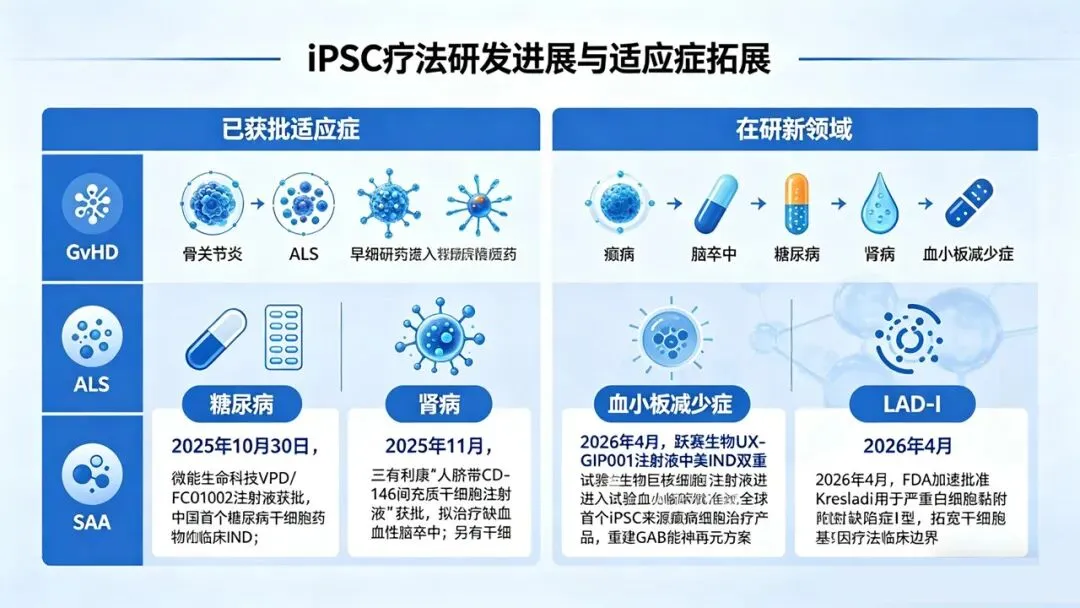癫痫:2026年4月,跃赛生物UX-GIP001注射液获得中美IND双重批准,为全球首个iPSC来源的癫痫细胞治疗产品,通过重建GABA能神经元功能恢复神经环路。