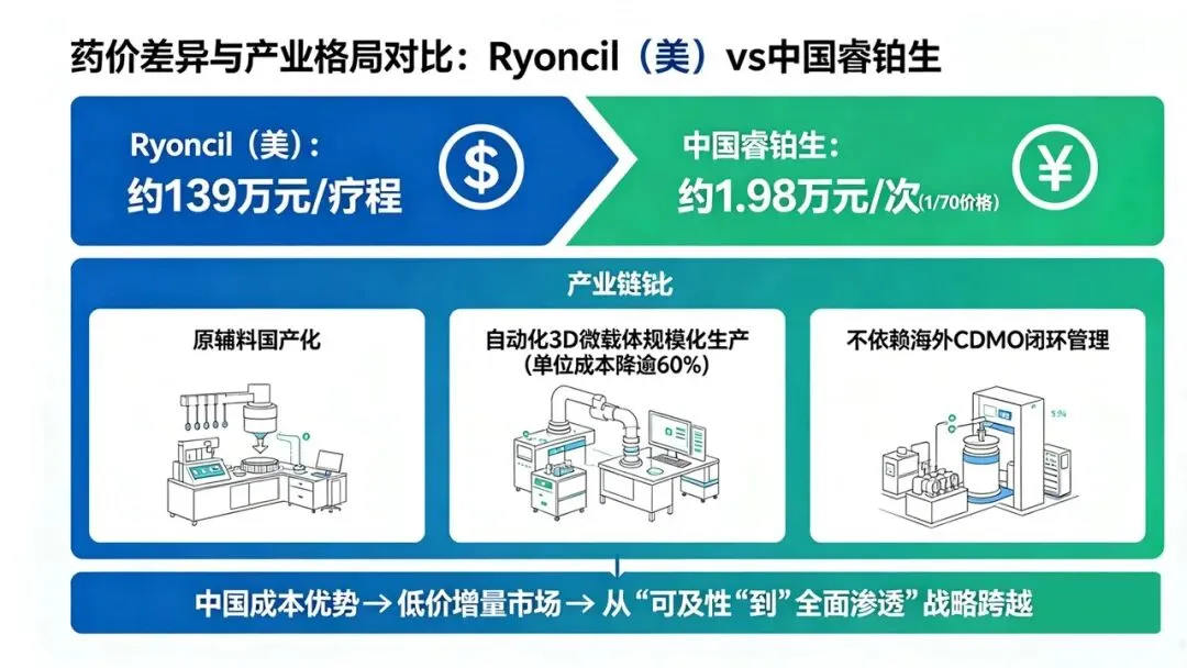 从药价差异便可看出产业格局差异:Ryoncil(美)约139万元/疗程,而中国睿铂生仅约1.98万元/次,后者以1/70的价格完成商业化突破。睿铂生之所以具备这一巨幅价格优势,并非单纯补贴或变相让利,而是得益于全产业链自主可控带来的降本效应——从上游原辅料国产化、到中游自动化3D微载体规模化生产(单位成本降逾60%),再到下游不依赖海外昂贵CDMO的闭环管理,使中国企业在生产成本与价格层面具备了强大全球竞争力。