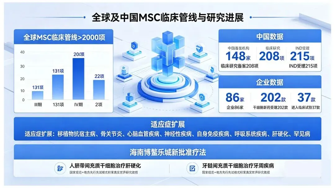 全球MSC相关临床管线已超过2000项,其中III期临床131项,IV期22项。中国方面,截至2025年底,国内148家备案机构、208项临床研究备案、215项IND受理;86家企业的202款干细胞新药获受理,其中37款已进入临床试验阶段。适应症正从移植物抗宿主病、骨关节炎、心脑血管疾病扩展到神经性疾病、自身免疫疾病、呼吸系统疾病、肝硬化乃至罕见病等诸多领域。