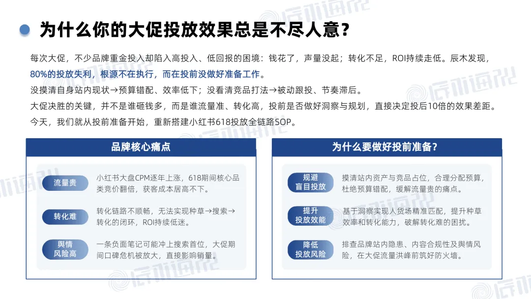 白皮书围绕小红书 618 大促全链路投放,从投前洞察、投中执行、投后复盘到行业案例,构建完整投放体系,核心解决品牌流量贵、转化难、舆情风险高三大痛点,强调投前准备决定 10 倍投放效果,80% 投放失利源于前期规划不足。————