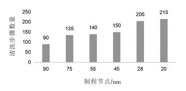 清洗工艺是芯片制造过程中占比最高的工序, 约占所有芯片制造工序的30%。随着超大规模集成电路的发展,芯片工艺节点进入28nm、14nm甚至更先进的节点,集成度不断提高,线宽不断减小,工艺流程更加复杂,清洗工艺步骤不断增加,清洗工艺变得更加复杂、更加重要和更具挑战性。90nm的芯片清洗工艺约90道,到了20nm芯片的清洗工艺达到了215道。随着芯片制造进入14nm、10nm甚至更高节点,清洗工艺的道数仍然要不断增加。