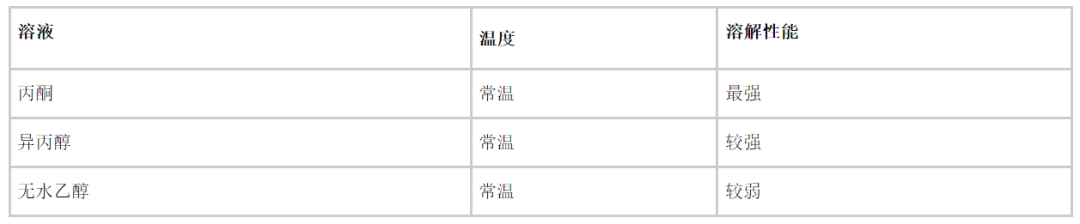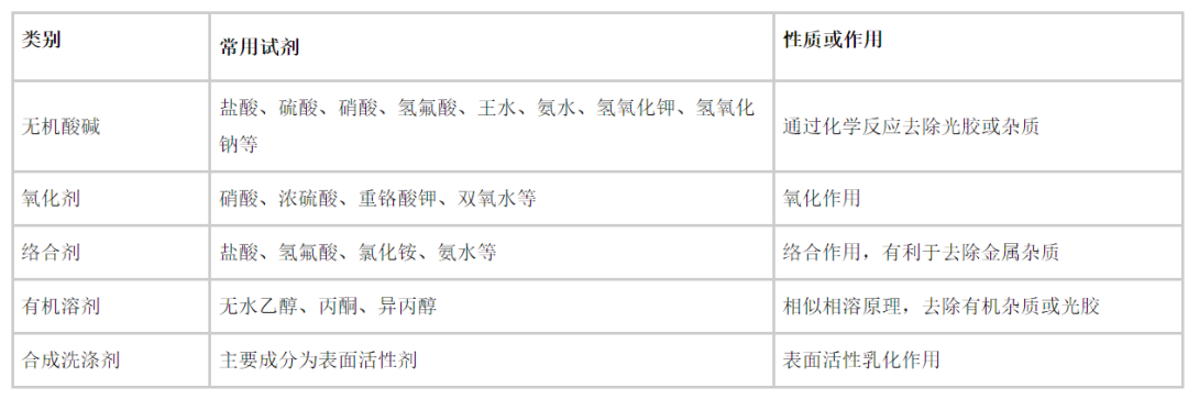在半导体制造过程中经常会涉及到一些特殊的工艺,不能使用上面介绍的这些方法,原因是清洗效率不够、对有些不能被洗掉的成分有刻蚀作用、不能生成氧化膜等,所以也会使用一些有机溶剂来达到清洗的目的。