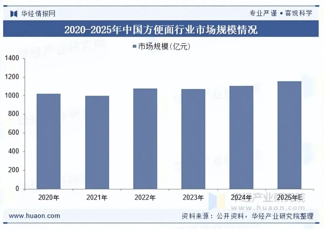 老母鸡汤方便面作为方便面的细分分支,完全遵循面饼搭配料包的产品结构,聚焦清淡鲜醇,以还原老母鸡汤本味为核心卖点,填补了方便面行业在清淡高汤赛道的空白,适配老人、儿童、清淡饮食人群等细分客群。老母鸡汤方便面作为高汤面品类的标杆产品,正不断开辟方便面行业中高端增量市场。2024年,中国方便面行业市场规模约为1105.4亿元。