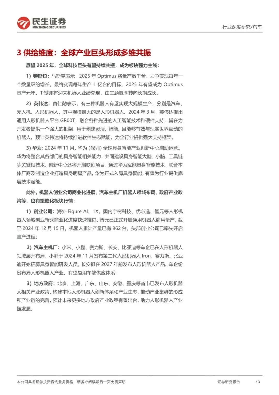 人形机器人板块正从主题投资迈向成长投资,2025年有望成为全球量产元年。技术端,大模型突破通用性瓶颈,DeepSeek低成本训练范式加速AGI落地;产业端,特斯拉、英伟达、华为等科技巨头密集布局;政策端,政府工作报告明确,培育具身智能等未来产业,大力发展智能机器人。我们预计,2025年全球出货量将达万台级别,2027年特斯拉目标产能突破百万台,产业链长期成长空间打开。