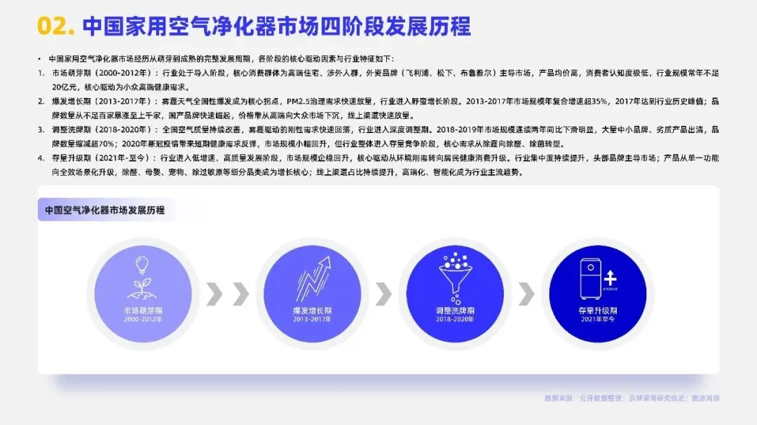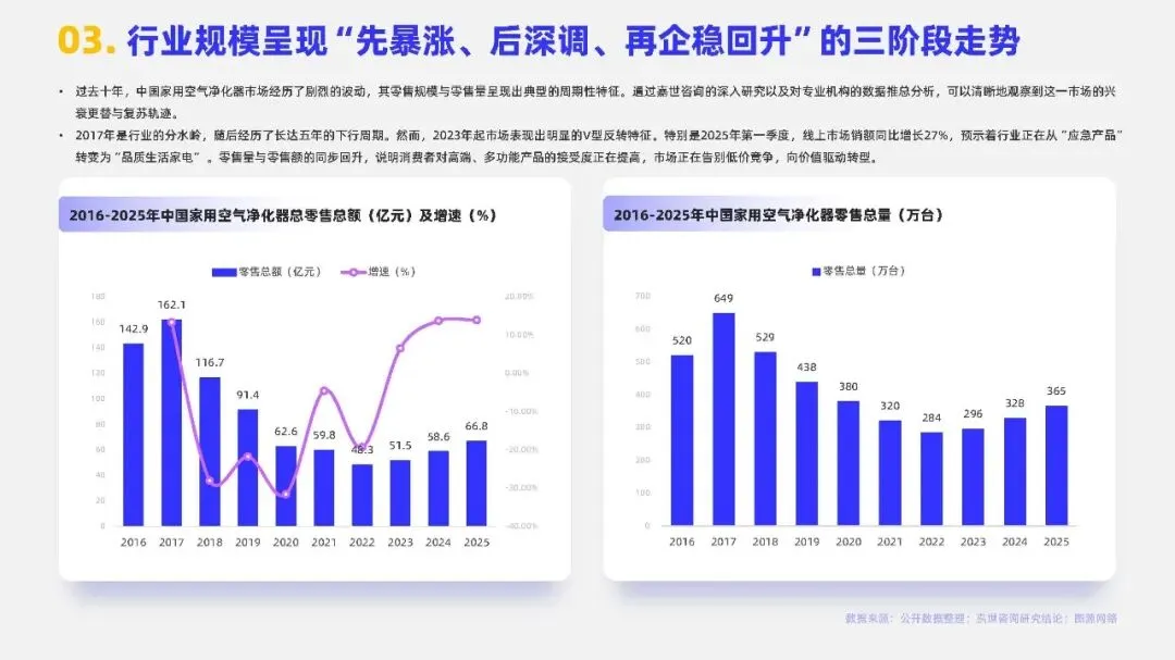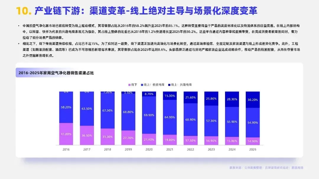 中国家用空气净化器行业已从早期的“雾霾驱动”全面转向“健康驱动”,进入存量升级期。国产品牌市占率超80%,并首次在4000元以上高端市场占据主导地位。线上渠道零售额占比突破85%,其中兴趣电商成为增长新引擎。