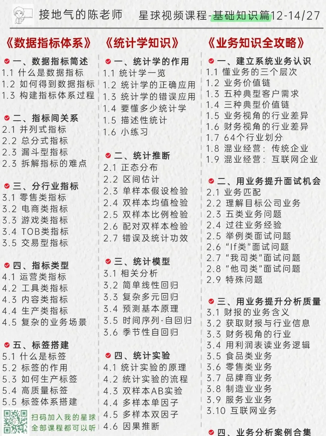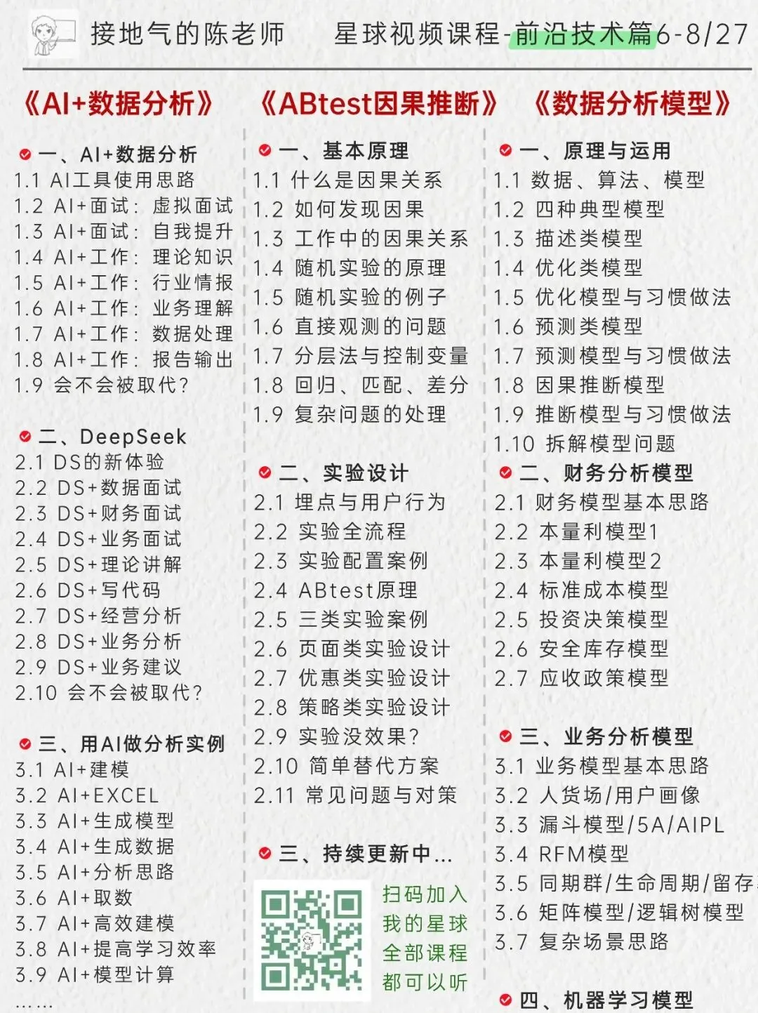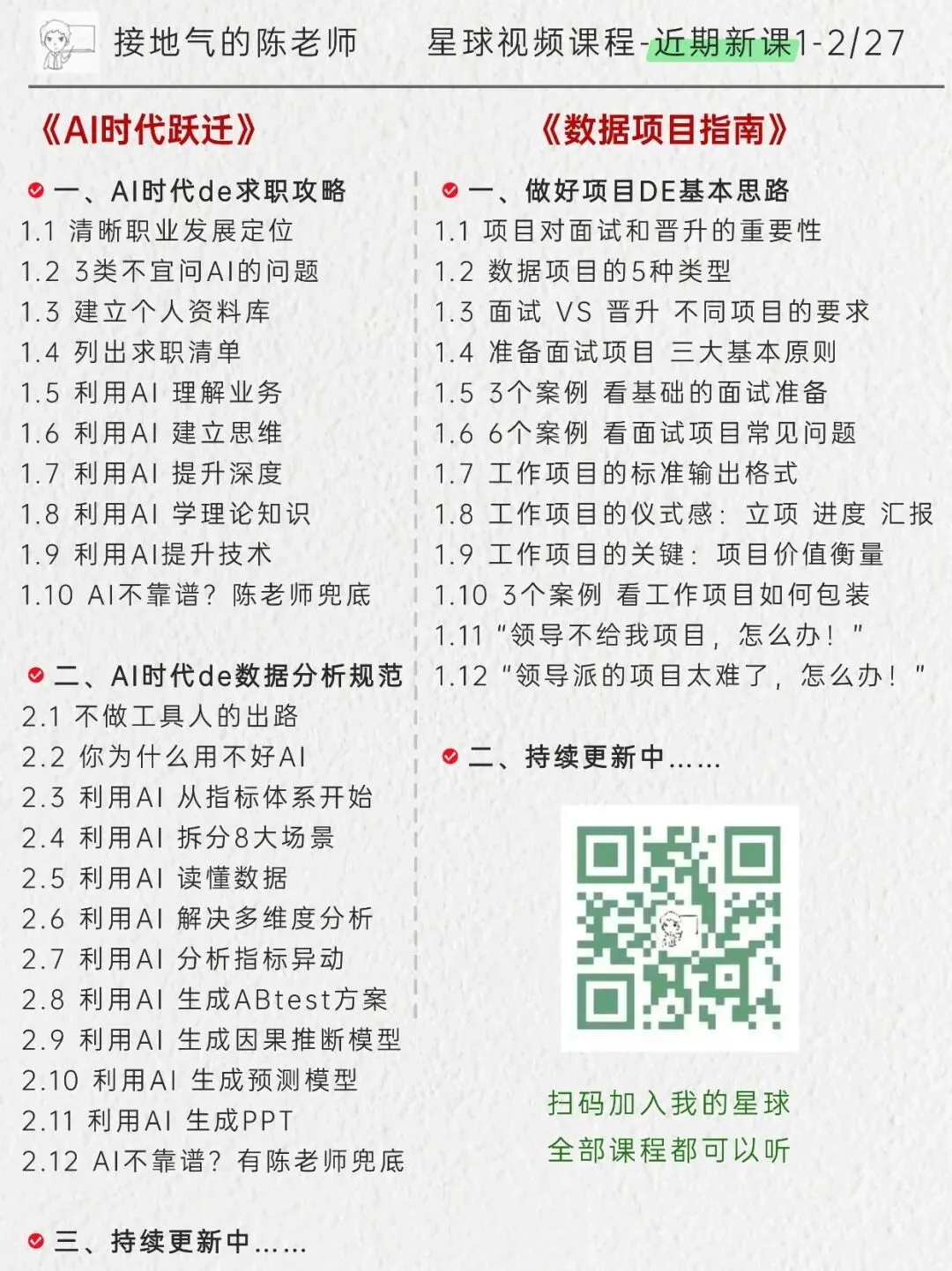课程目录如下,加入星球我就给你一对一制定学习计划,通过【视频课程-参加训练营-做实战项目-一对一辅导】的路线,进步看得见!点此详细了解星球:我的AI数据学习小圈子