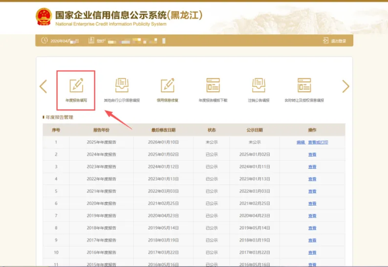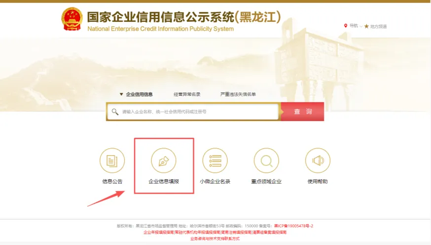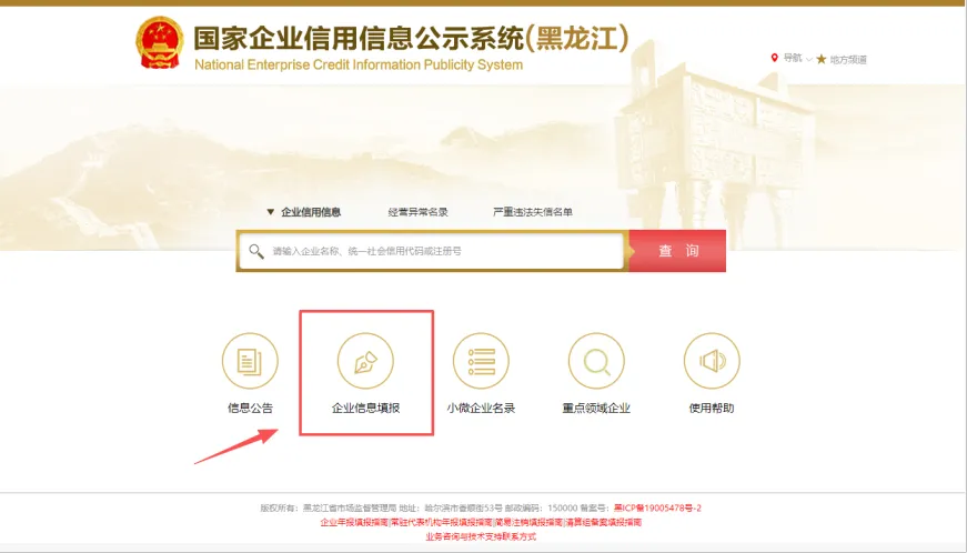 1.进入“国家企业信用信息公示系统(黑龙江)”后,点击“企业信息填报”进入企业年报。