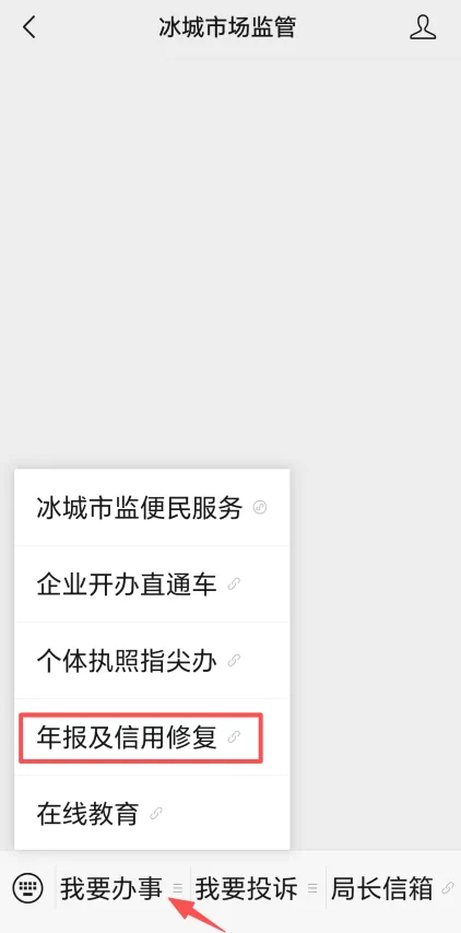 2.手机填报:关注“冰城市场监管”微信公众号,点击下方菜单栏【我要办事】-【年报及信用修复】即可进行年报。