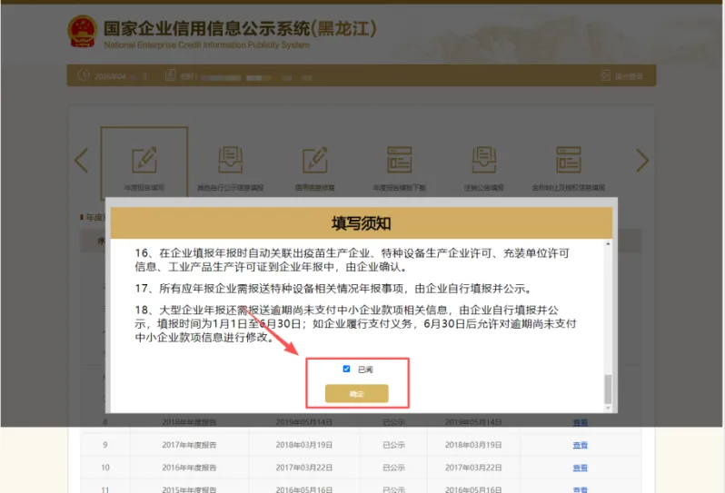 3.点击左上角“年度报告填写”。弹出年报须知,阅读后,在下方“已阅”前的小框内打“√”(对勾),再点确认。如果以前存在没有参加年报的年度,先需要将以前年度补报后才可申报本年度的。