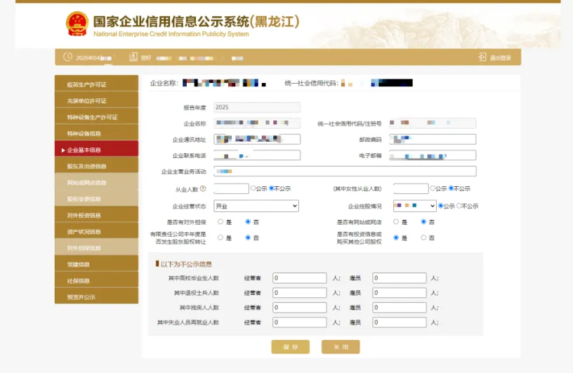 6.企业基本信息需要填报的通信地址、邮政编码、联系电话、电子邮箱、存续状态、网址、网站信息均为报送时的信息,其余信息为所报告年度12月31日的信息。填写完后点“保存”。