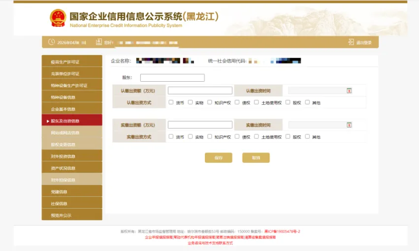 7.股东及出资信息根据实际情况点击“添加”进行填写(分公司无需填写)。按照公司章程上约定的填写股东出资额及出资时间,每一个股东(发起人)的出资信息只需填报一条,股东(发起人)认缴和实缴出资额为截至报告年度12月31日的累计数额;认缴和实缴出资时间为截至报告年度12月31日最后一次认缴和实缴时间,出资方式可以多选。点击“保存”。如还未发生实缴,则实缴部分暂时不需填写,填写认缴信息后即可保存。注意:系统默认填写数额单位为万元,填写时要注意核对数额大小准确性!只填写数字即可,不要在数字后面加“万”字,否则不能保存。