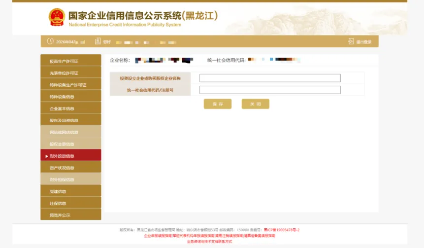 8.对外投资信息根据实际情况点击“添加”填写相关信息,填写完成后完点击“保存”。如无对外投资情况变更的则无需填写此项信息。
