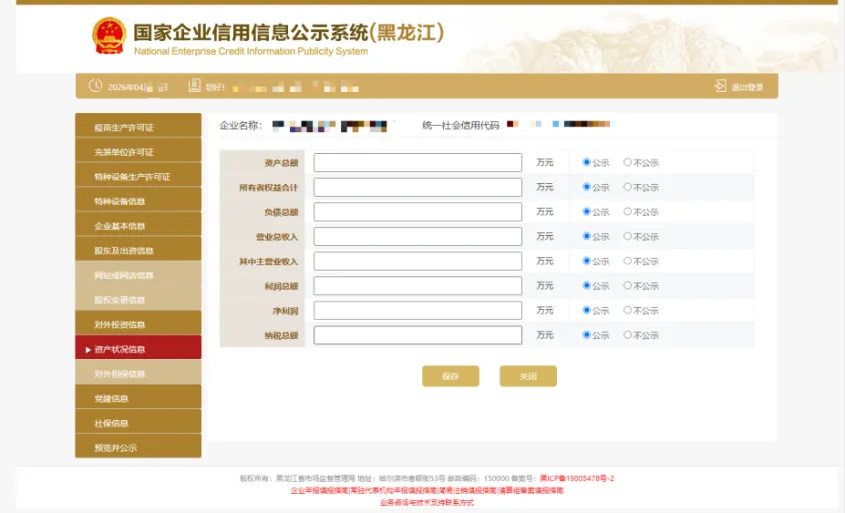 9.资产状况信息直接点击填写。企业资产状况信息,应当是企业年度资产负债表和损益表(利润表)中的期末数;纳税总额为企业全年实缴各类税金的总和。根据审计报告、资产负债等如实填写企业资产状况,若选择“公示”则对外公示,若选择“不公示”,则公示查看该指标不对外公示,显示“不公示”。