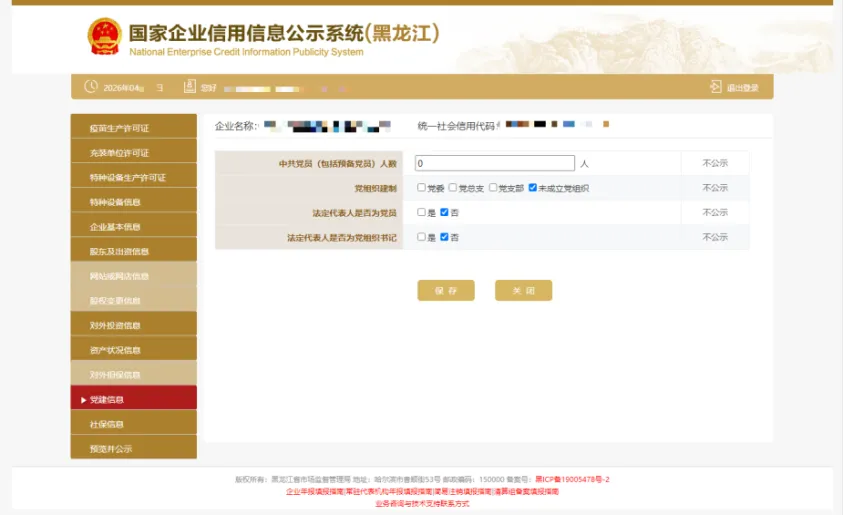 10.党建信息是不公示信息,主要采集私营企业党组织的建立情况,但属于抽查范围,请注意如实填写。其中,中共党员(包括预备党员)人数,为截至年度报告年份12月31日的人数。如企业暂无党员,填写“0”人后点击保存即可。