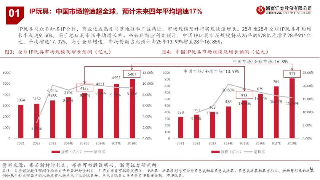 • 中国主导全球潮玩增长引擎:2028年中国IP玩具市场规模将达911亿元,占全球份额从13.99%提升至16.85%,年均增速17.02%,远超全球9.5%的平均水平,成为出海品牌首选跳板市场。
