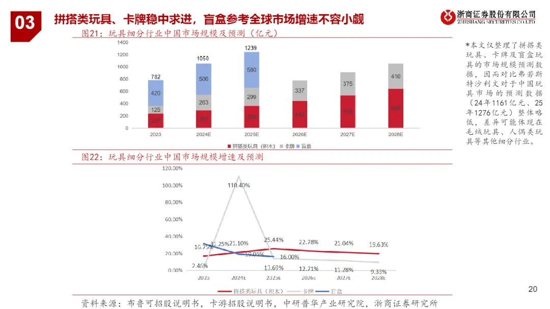 • 三大赛道增长动能分化明显:拼搭类玩具以21.14%的复合增速领跑(2025-2028),盲盒紧随其后(中国市场预期增速16%),卡牌因低龄客群与低价策略增速放缓至11.16%(2025-2029);但卡牌凭借71.1%的极高市占集中度与“炒卡”文化,具备极强渠道控制力与私域变现潜力。