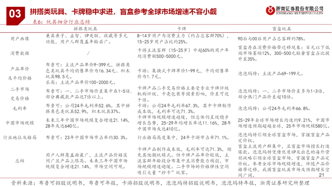 • 毛利率与运营效率成胜负手:卡游卡牌毛利率高达71.3%(成本极低),泡泡玛特盲盒为66.8%,布鲁可拼搭类为52.6%;卡游在存货与应收周转效率上全面领先,体现“高频快消+强控价”模型优势,适合复制至海外新兴市场。