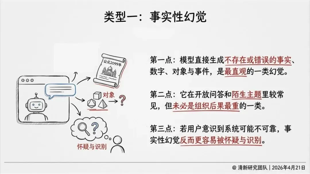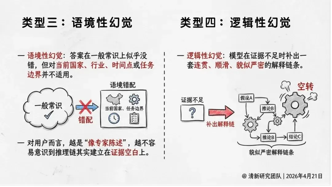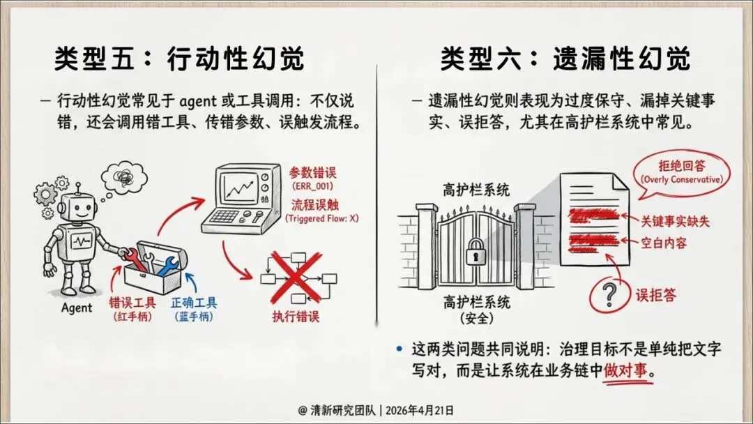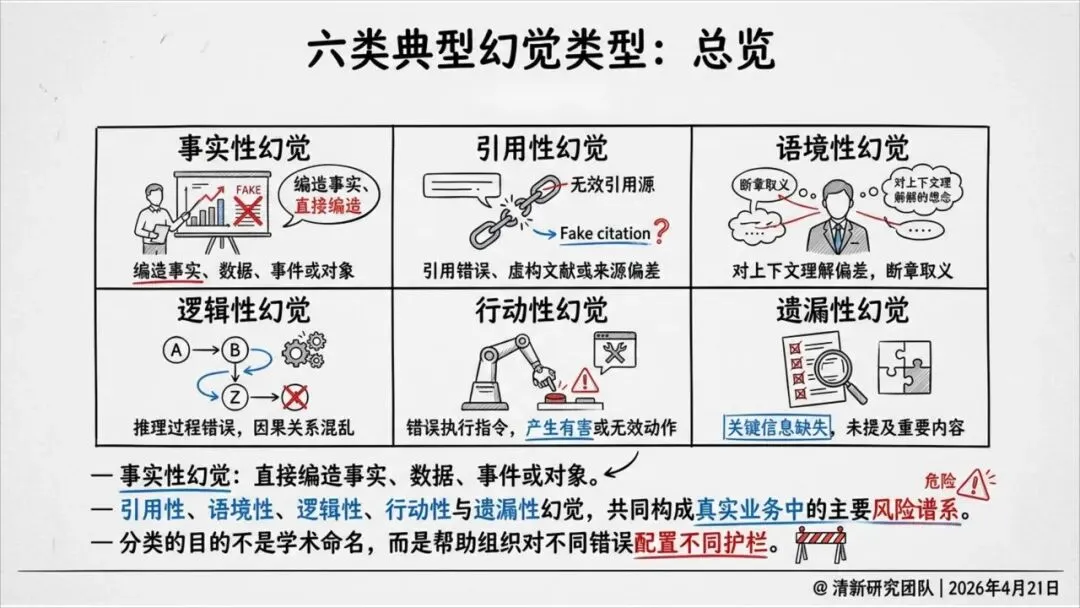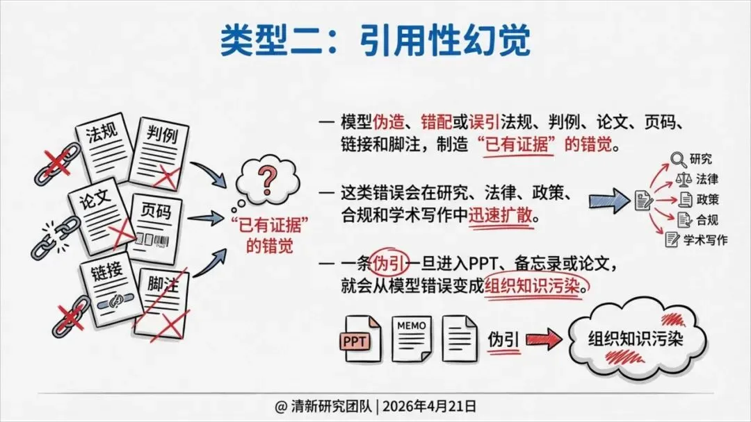 这就导致了六种幻觉——不只是事实错误,还包括伪造引用、逻辑断裂、语境错位、执行错误等。其中,引用性幻觉尤其危险:AI会伪造法条、判例、论文页码,把虚假证据包装得像模像样,一旦被写进PPT、备忘录或报告,就成了组织知识的污染源。