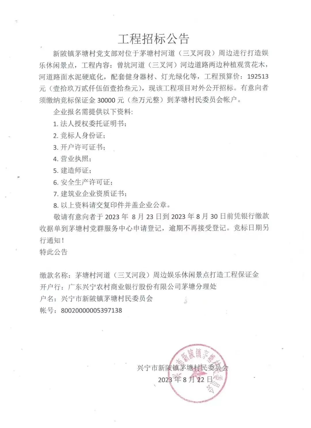 兴宁新陂镇茅塘村招标公告!