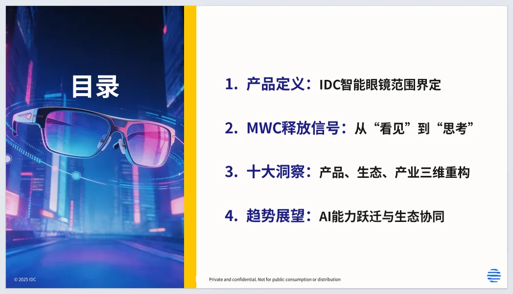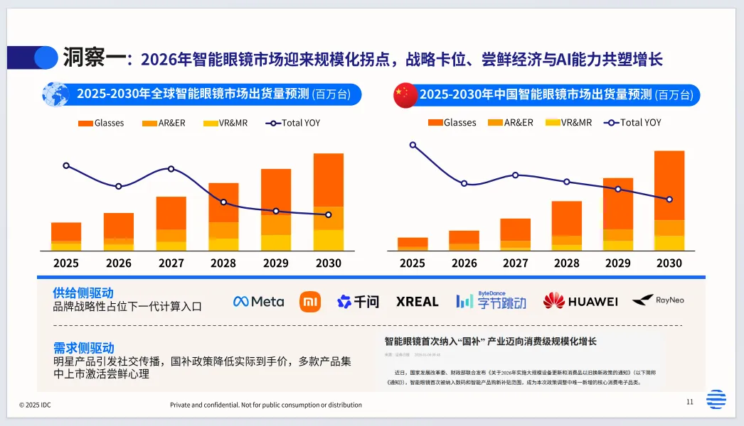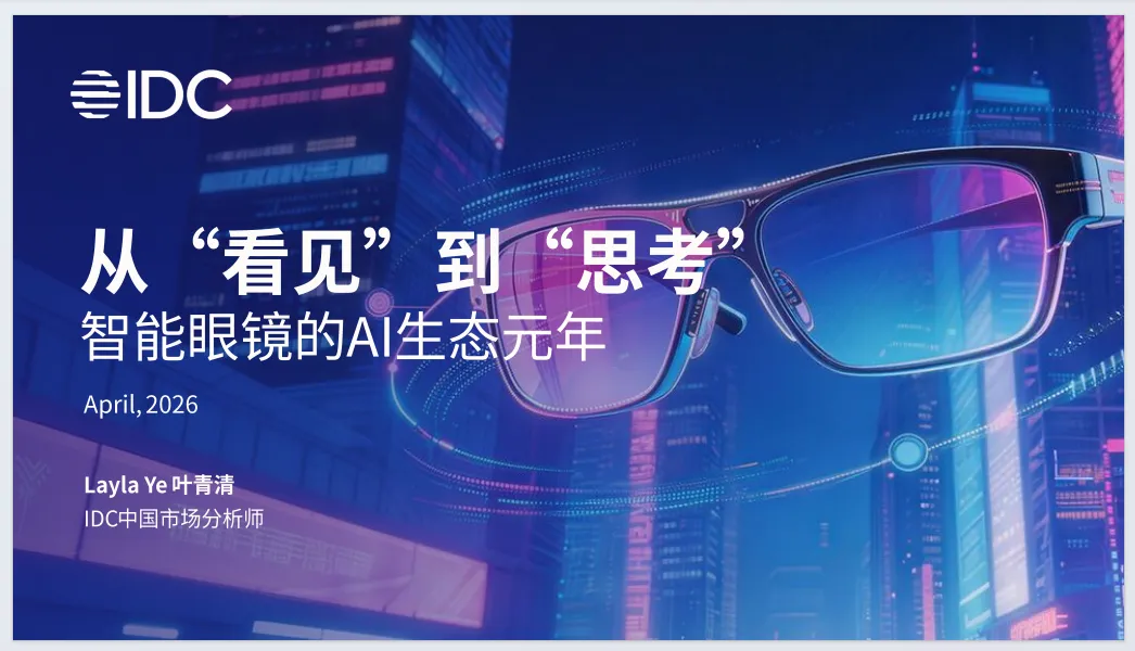 《2026年智能眼镜数据洞察与研究分享报告》由IDC发布,聚焦2026年智能眼镜产业,指出行业正式迈AI生态元年,完成从“看见”到“思考”的关键跃迁。报告界定智能眼镜包含音频类、AR/ER/VR/MR等品类,2026年市场迎来规模化拐点,国补政策与AI能力共同驱动增长。