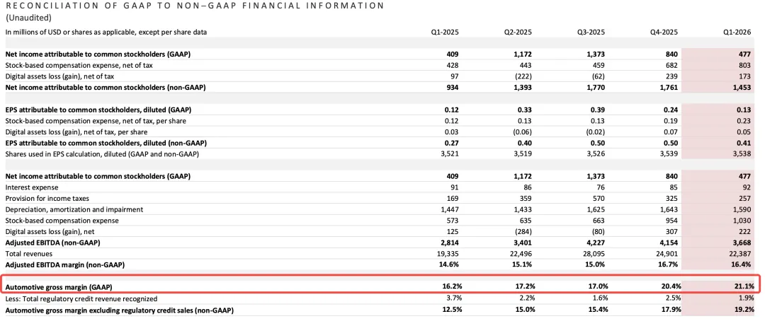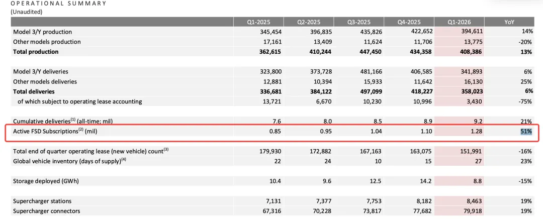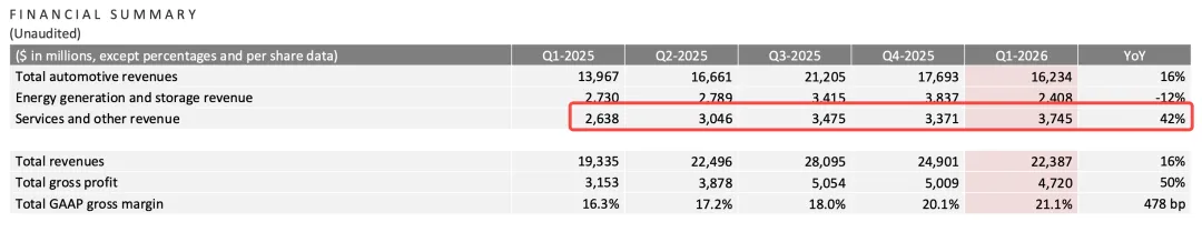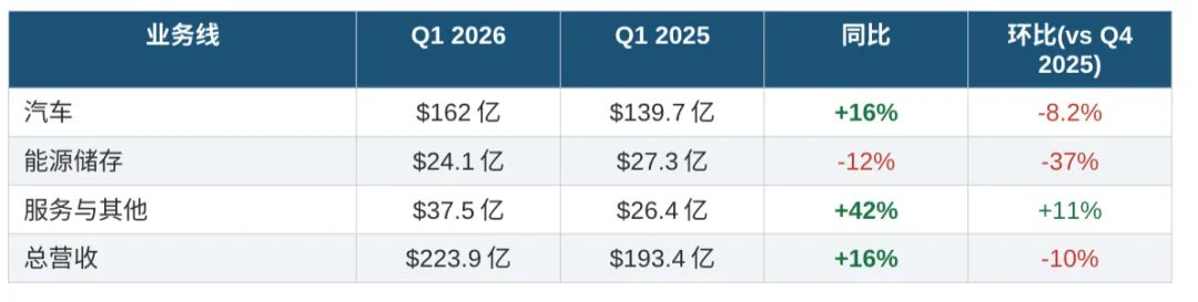 市场普遍预测18-19%,结果跳出来一个21%,背后的逻辑是 FSD 订阅制转型见效了——特斯拉去年把全自动驾驶从一次性买断改成按月订阅,现在有128万活跃订阅用户,同比增51%。订阅是软件逻辑,毛利率天然比卖车高,所以服务类收入一起来,整体毛利结构就变好看了,如果国内FSD落地,相信这一指标会跳涨。服务与其他收入这个板块,这季度37.5亿美元,同比增42%,比整车业务增速还快。这是个值得认真对待的信号:特斯拉的收入构成确实在悄悄变化。当然,也不是全好。能源储存业务营收24.1亿,同比跌了12%,环比Q4 2025暴跌37%(见上面截图),这个波动有点大。管理层说是部署节奏的问题,但这个板块下季度如果不反弹,就得重新审视了。然后说那个把股价打下去的消息